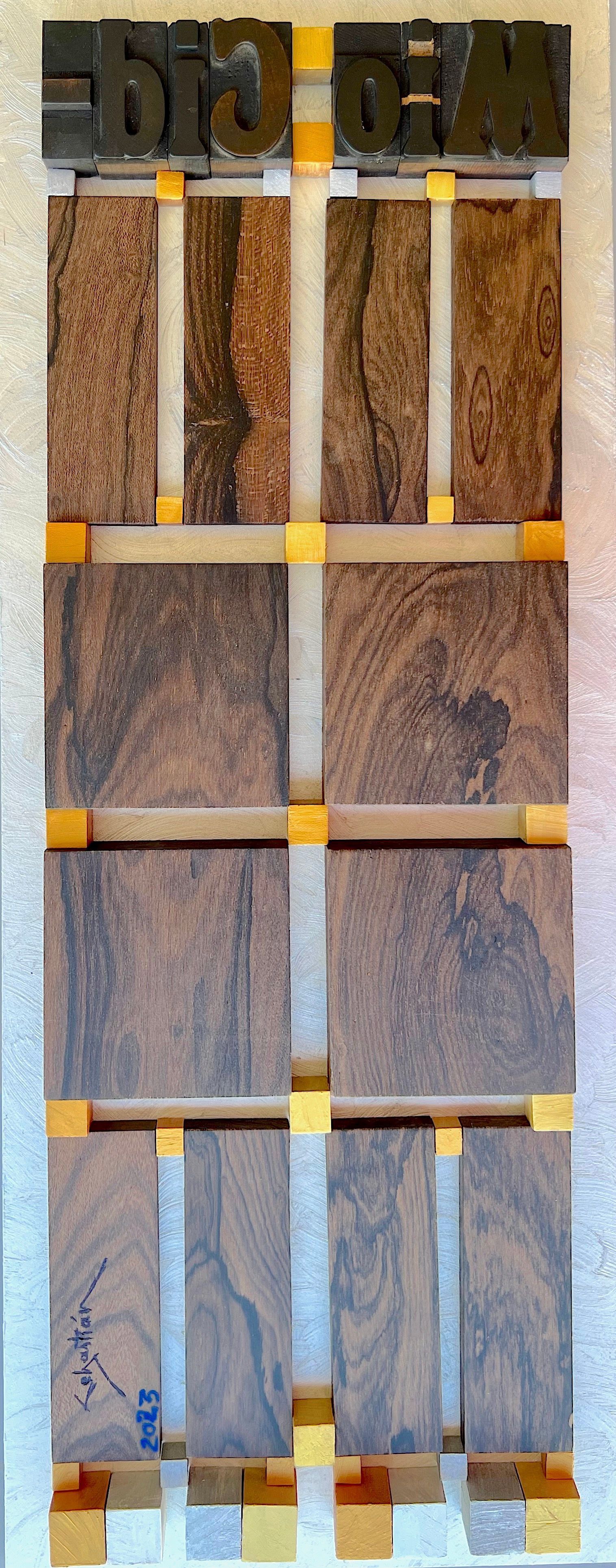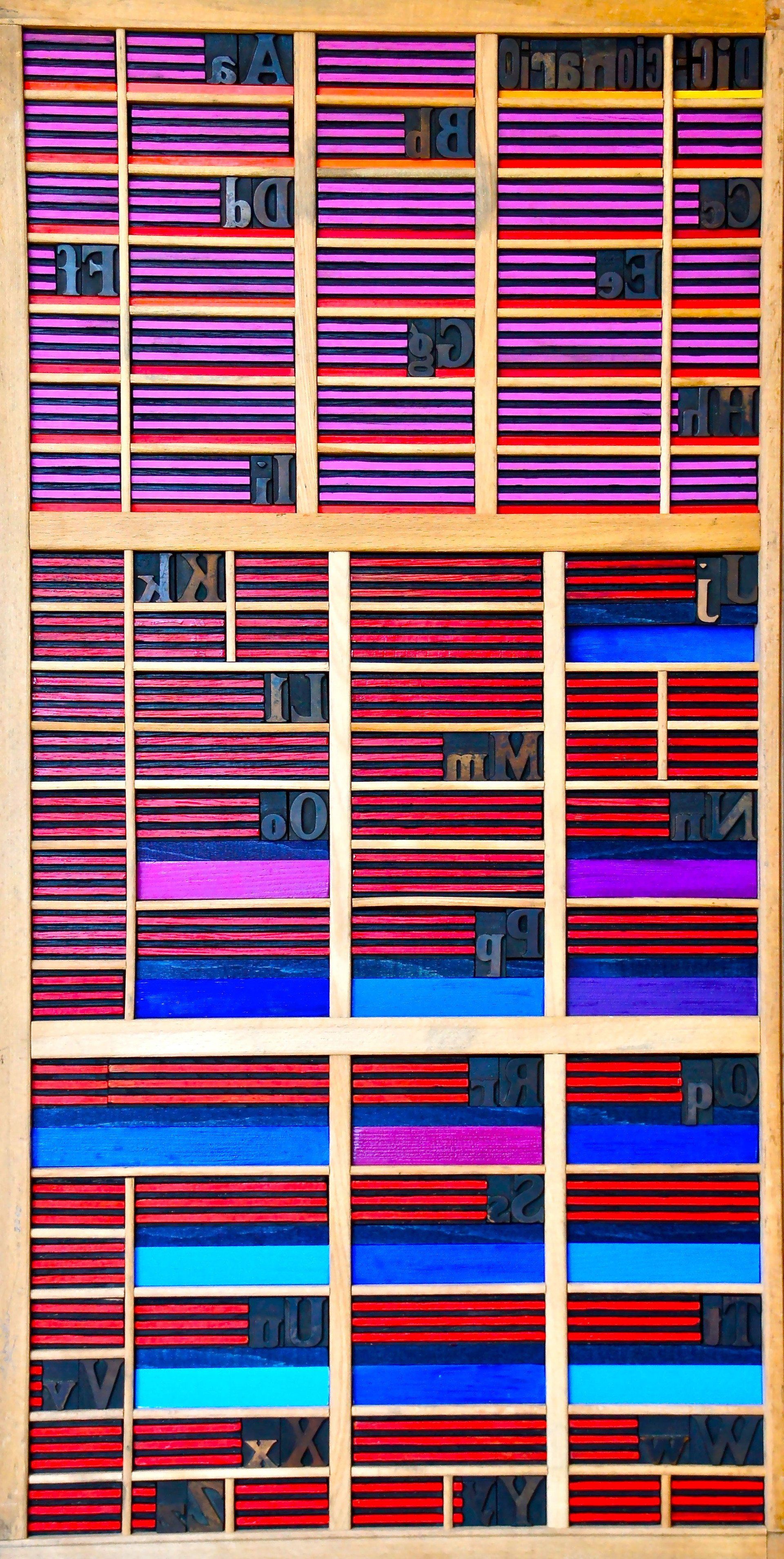 Un proyecto iniciado en 2011, para la conservación y difusión los tipos móviles de madera de la imprenta tradicional, reinventada por Gutenberg en 1450 y creada en China ya casi un Milenio (1041-1048). Justo 8 siglos (1221) hace, por otra parte, que se extendió su uso a Corea y se consolida su fabricación en madera y aleaciones de metal, para sustituir a la porcelana inicial. Este patrimonio material de nuestra cultura no podía seguir desapareciendo, y de este modo, integrado en obra de naturaleza geométrica pervive y se difunde a la vez que se expone la obra. En 2013 se expuso por primera vez en la sala de la Universidad de Querétaro en México y en la Escuela de Artes de Málaga con motivo del Centenario del Cubismo. En 2016 se expuso, ya más avanzado, en el Museo de la Imprenta y las Artes del Libro, del Ayuntamiento de Madrid, y en la Sala del Rectorado de la Universidad de Málaga. El libro sobre los tipos móviles y la historia de la imprenta y la tipografía en Europa con especial dedicación a nuestro país, mas una selección de la obra, se puede bajar aquí. Las obras del proyecto son un homenaje a la Lengua Española y a las Artes del Libro, como pueden ser las dedicadas al Maestro Impresor, a las diferentes técnicas de estampación y grabado para las ilustraciones en la imprenta, a los más destacados diseñadores de tipos, a la Biblioteca Nacional, a Nebrija como artífice de la primera gramática y el primer diccionario del Español, a la columna de texto, al primer papel de occidente, etc.