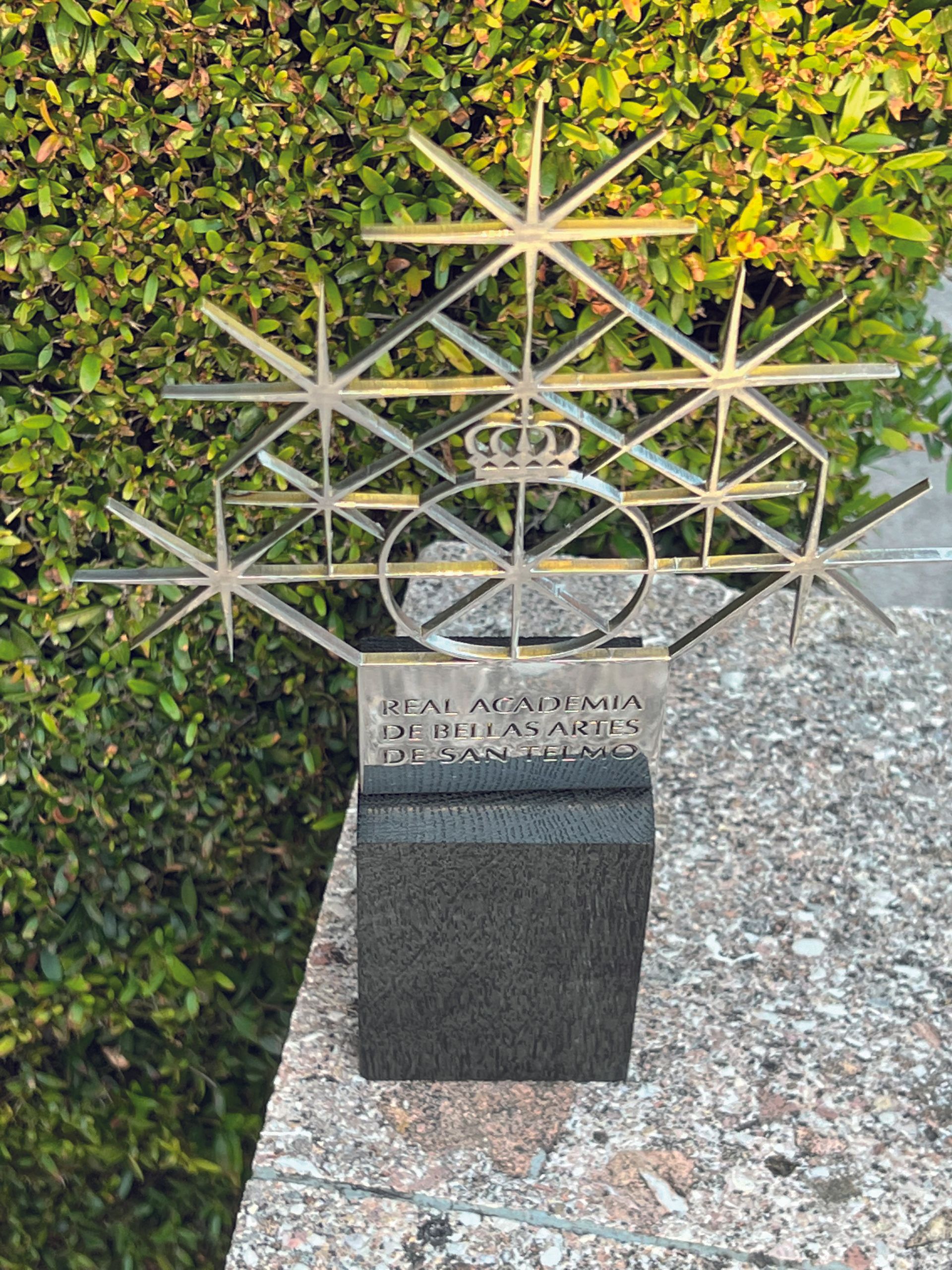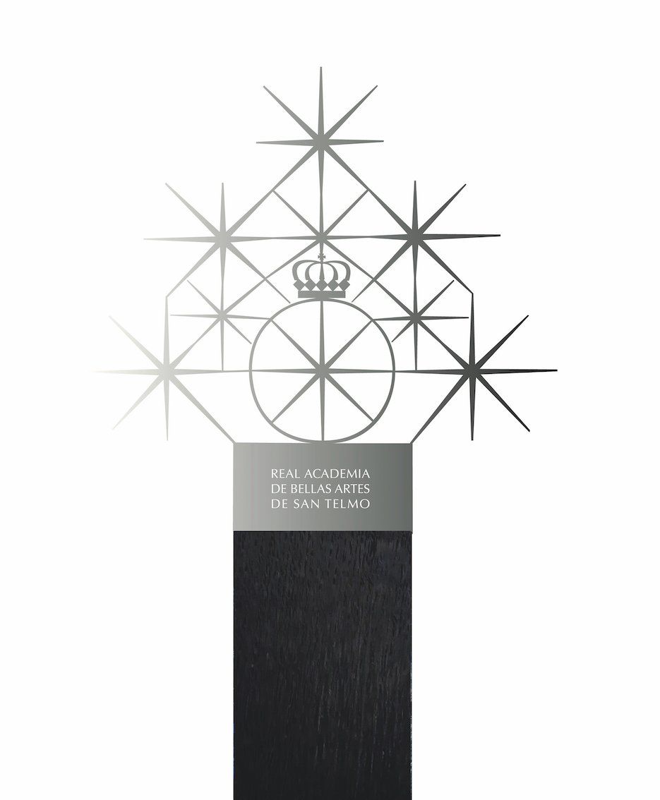 ButtonEscultura plana en acero de primera calidad, pulimentado y con base de madera tratada y pigmentada. Alrededor del nuevo emblema de esta Real Academia se unen otras personalidades y entidades que reciben este galardón y que son también un foco de luz en el ámbito de la Cultura, las Artes y el Medio Ambiente.